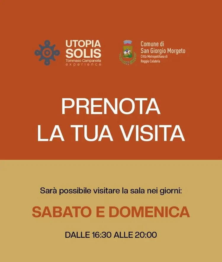 Da oggi potrete prenotare l'ingresso alla nostra sala immersiva! ☀️ Utopia SOLIS - Tommaso Campanella Experience Assicuratevi di roenotare entro venerdì il vostro ingresso per le giornate di SABATO E DOMENICA dalle ore 16:30 alle ore 20:00. Qui il modulo con la sceta della fascia oraria più adatta a