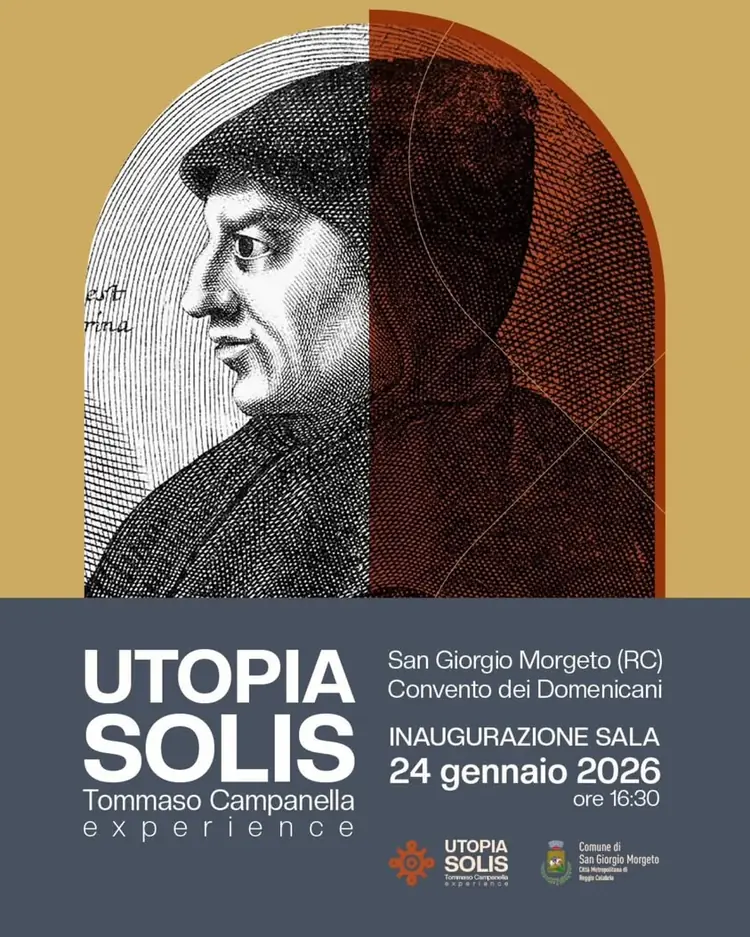 Utopia solis. Inaugurata, ieri pomeriggio, nei locali del Convento dei Domenicani di San Giorgio Morgeto, tornati, dopo tanto tempo di oblio ed abbandono, al loro antico splendore, una bellissima mostra con una sala immersiva semplicemente magnifica. Rivive in essa la figura maestosa di Tommaso Cam